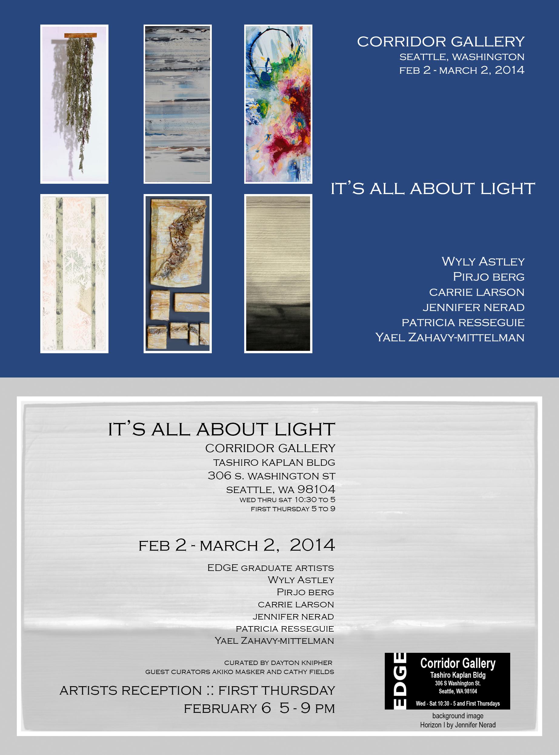 I am pleased to be included in a group show this month at the Corridor Gallery in the Tashiro Kaplan building. The theme of this show is “It’s All About Light.”
