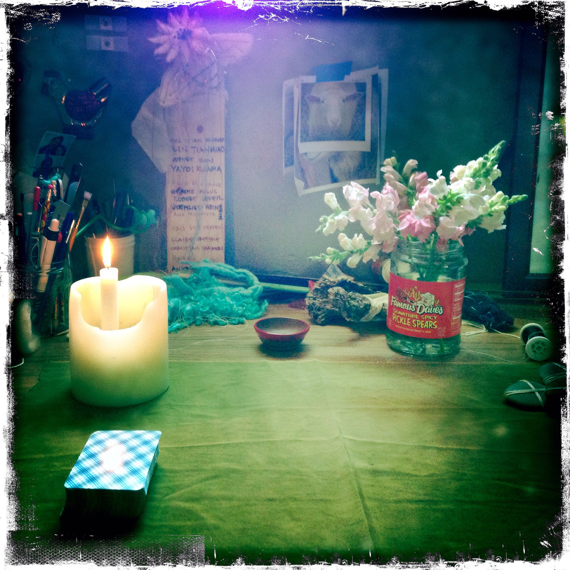 I asked festival goers to participate in the performance by spending quiet time in the space and leaving any burdens with me.  I, in return, read the burdens and made offerings of words and tokens in the form of “prescriptions” and “remedies”. The exchanges were anonymous.  I could not see who was in the space and I was in a masked costume.